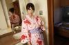 透き通るような白い肌に美しいブルーの瞳に透け着物の和装が目を引くブロンド美女のアナスタシアが「洗練された大人のいやし亭」で和風おもてなしご奉…